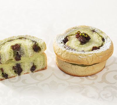 抹茶風味のブリオッシュ生地にバターを折り込み、練乳とバニラで風味付けしたレーズンと抹茶のバタークリームを巻き込みました。しっとりと歯切れある生地にレーズンと抹茶の風味が感じられる食パンタイプの商品です。